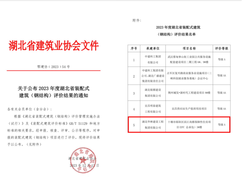 近日,湖北省建筑業(yè)協(xié)會(huì)公布了《關(guān)于2023年度湖北省裝配式建筑(鋼結(jié)構(gòu))評(píng)價(jià)結(jié)果的通知》。湖北華林建設(shè)工程集團(tuán)有限公司(以下簡(jiǎn)稱“華林建工集團(tuán)”)在十堰市鄖陽(yáng)區(qū)濱江尚都保障性住房項(xiàng)目(EPC 總承包)3#樓的施工中,展現(xiàn)了出色的技術(shù)實(shí)力和工程管理能力。該項(xiàng)目被評(píng)選為2023年度湖北省裝配式建筑(鋼結(jié)構(gòu))評(píng)價(jià)等級(jí)A級(jí),充分證明了華林建工集團(tuán)在裝配式建筑領(lǐng)域的領(lǐng)先地位。
